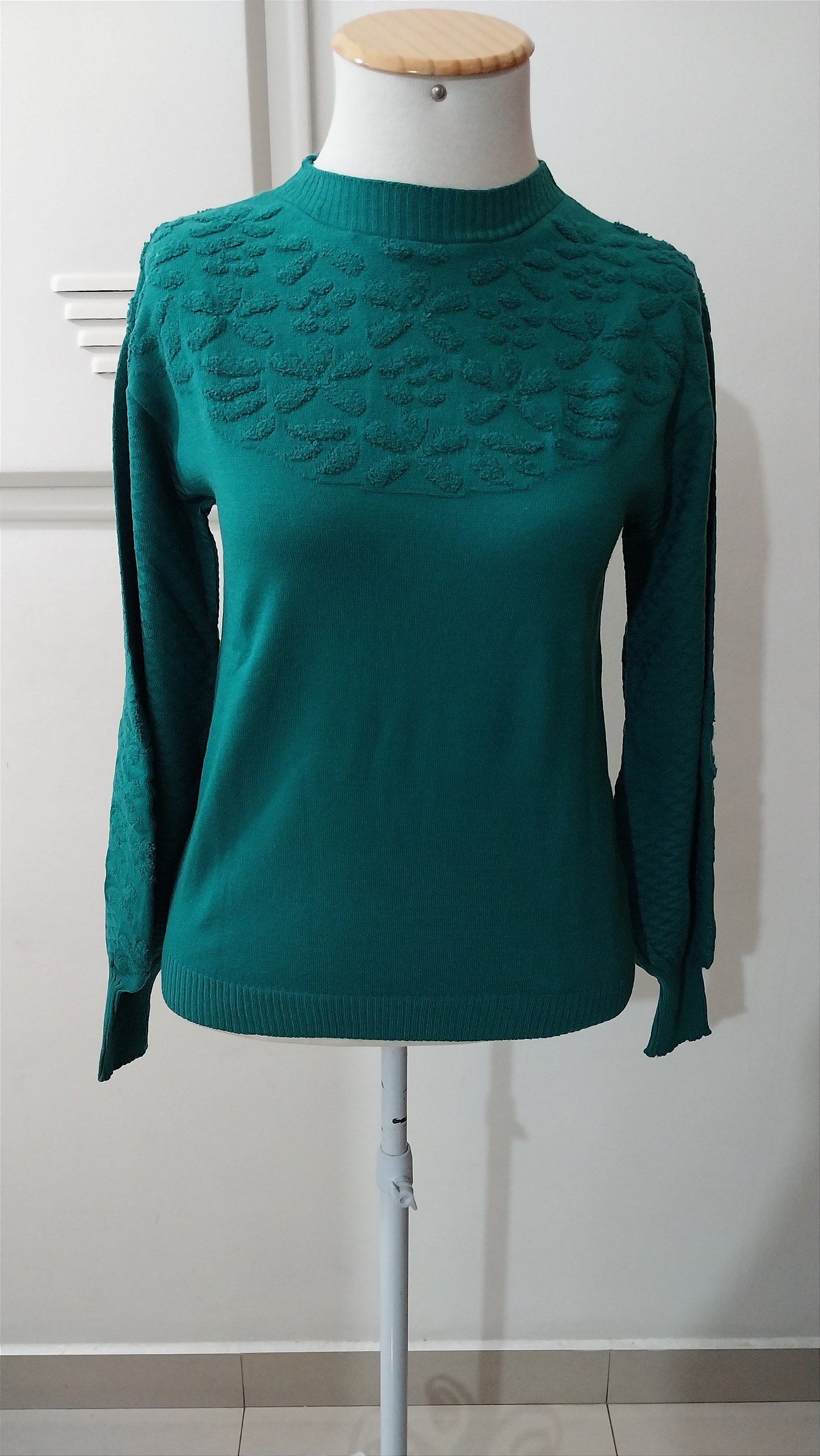 Blusa fio modal com trabalho em puff na frente e nas mangas. Tamanho único. Cor verde esmeralda. Composição 50%viscose 28% poliéster 22%poliamida