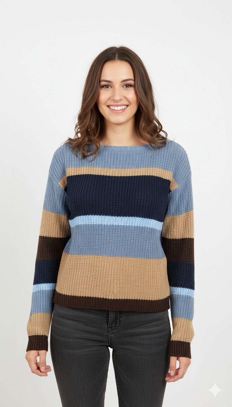 Blusa crooped de tricot 100% poliester listrado. Tamanho único que veste até um 42. Cor azul jeans
