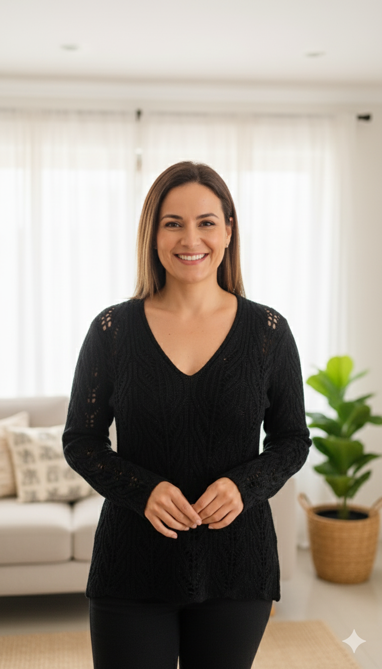 Blusa de tricot trabalhado decote V e fio de lurex dourado 100%acrílico. Tananho único. Cor preto