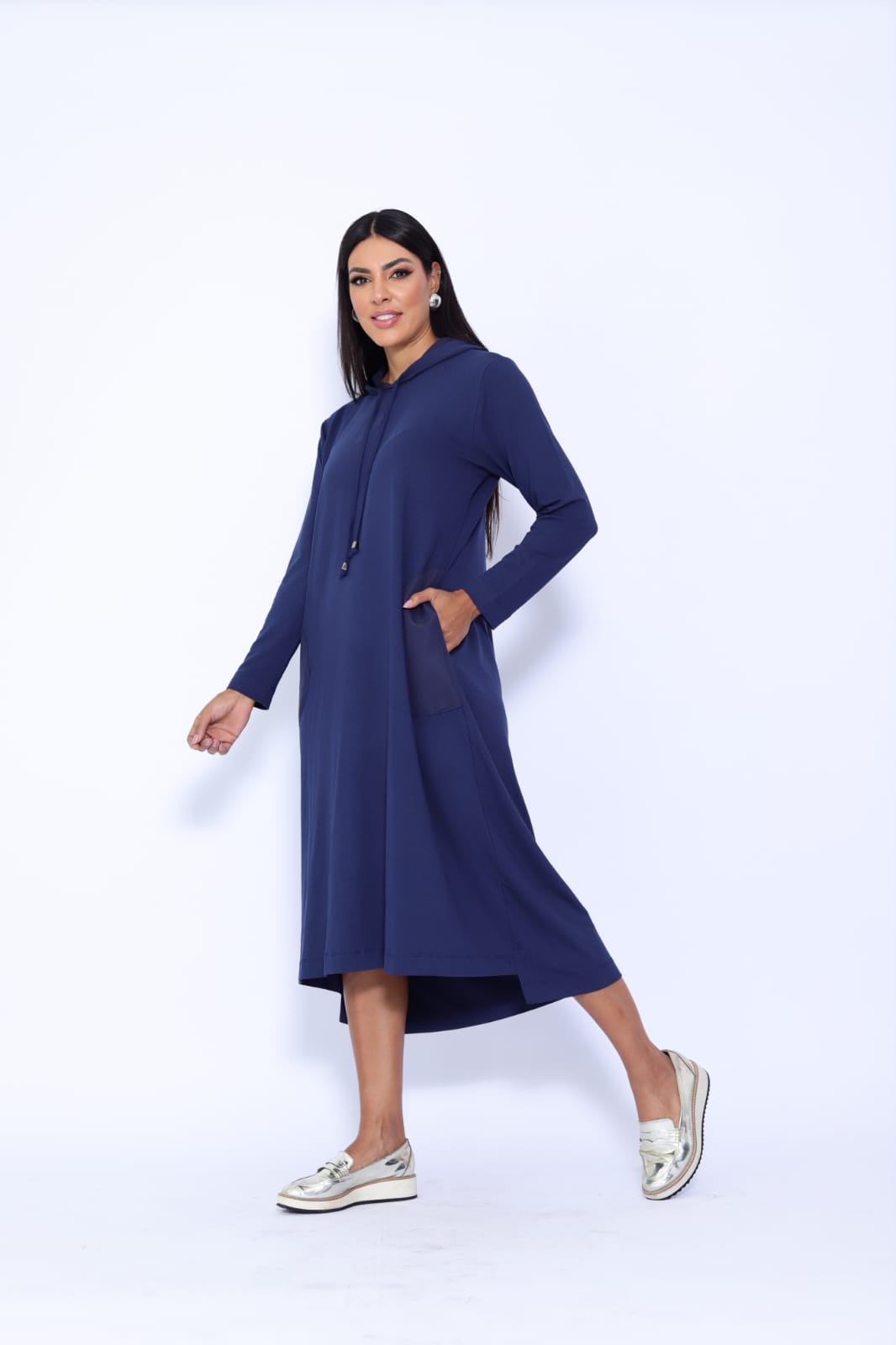 Vestido algodão com elastano, com capuz e bolsos. Tamanho único que veste até um 46.