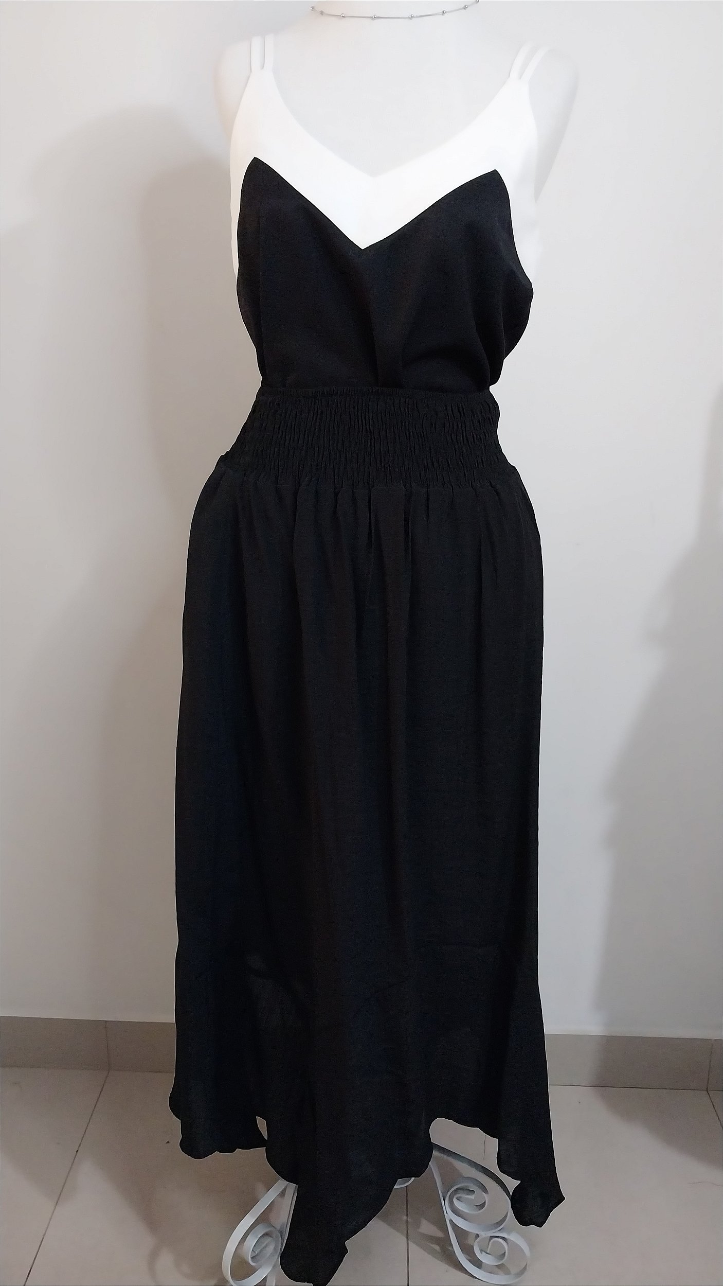 Saia de viscose mista 64%viscose 36% poliéster super leve com forro. Tem cibtura de látex que estica bem. Tamanho P. Cor preto