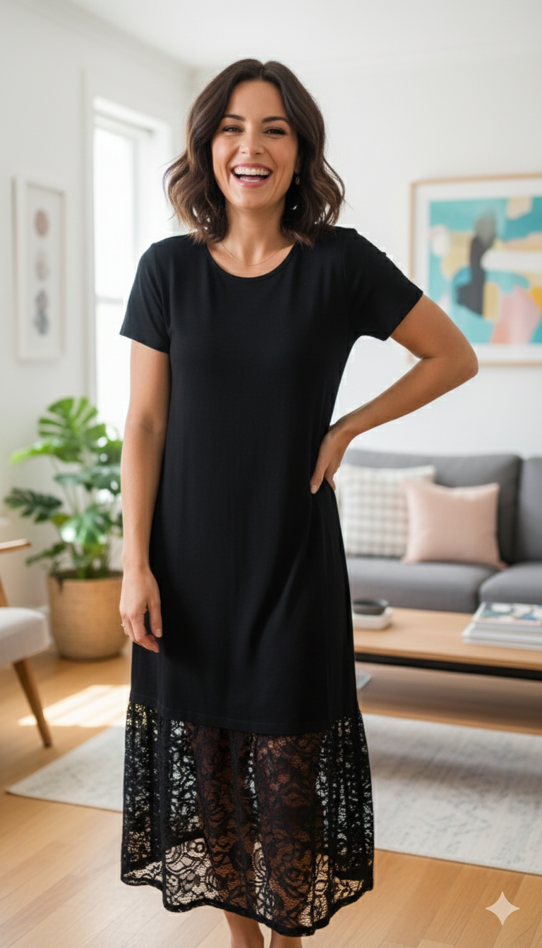 Vestido de viscolycra premium com barra de renda de poliamida. Tamanho único que veste até um 44. Cor preto