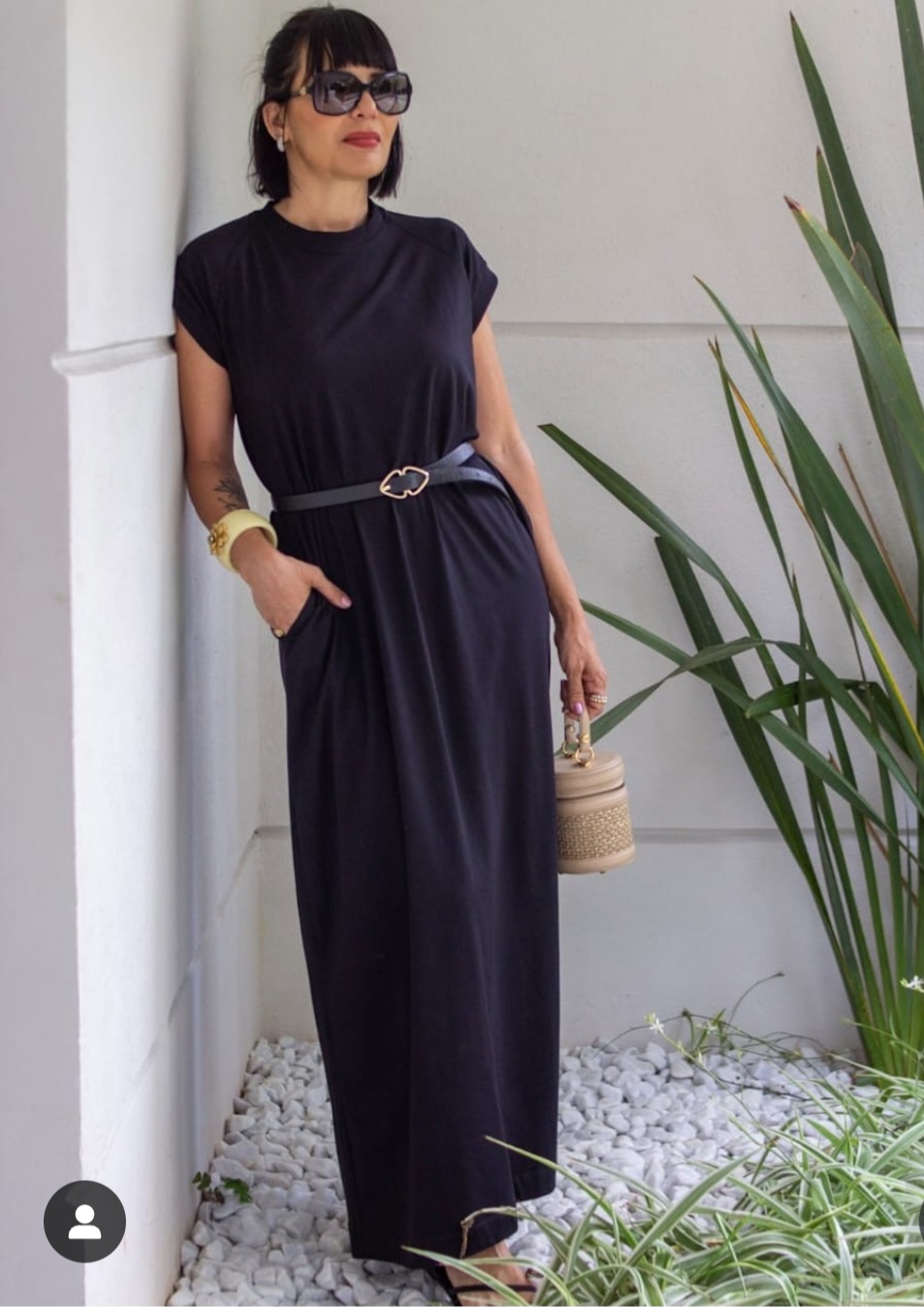 Vestido longo de algodão com elastano. Possui bolsos e cinto de tira para a cintura. Tamanho único que veste até um 46