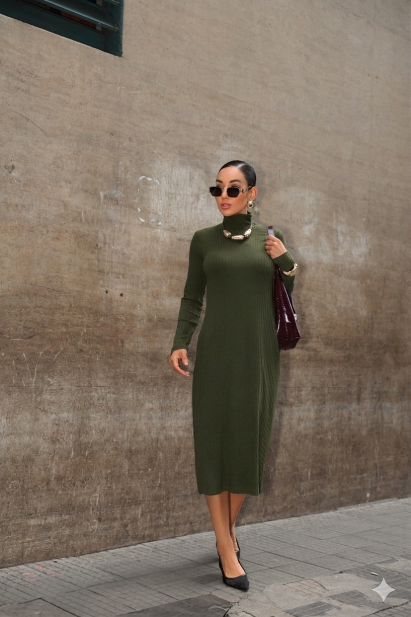 Vestido de viscolycra canelado com bolsos. Tamanho único que veste até um 42. Cor verde militar