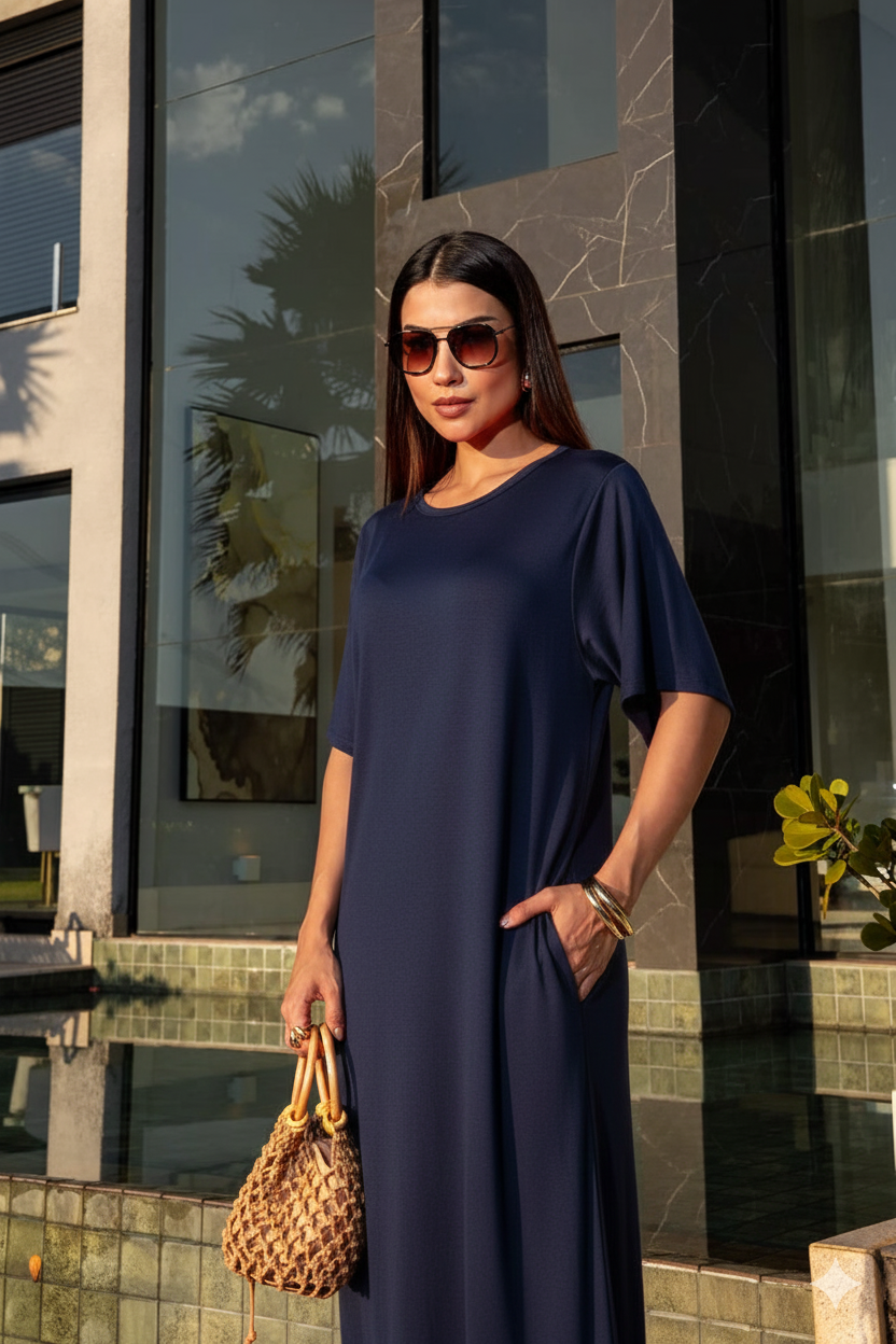 Vestido  basico mido visco modal. Tamanho  único  que veste  até um 44. Cor azul  marinho