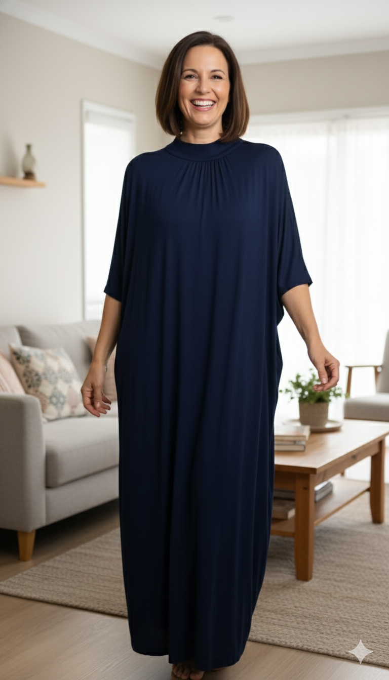 Vestido de viscolycra longo gola alta manga japonesa com laços nas costas. Tamanho único que veste até um 48. Cor marinho
